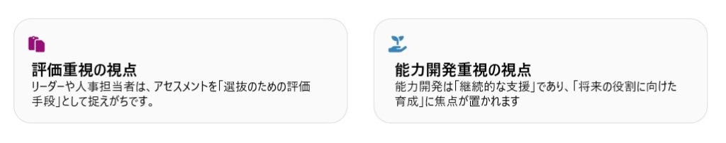 一方、能力開発は「人材開発(学習と成長)」のチームが中心となって行われます。彼らはスキルの開発やスキルギャップの解消、パフォーマンス向上を目的とした研修、コーチング、学習体験の提供に取り組んでいます。その目的は評価ではなく「成長の支援」にあります。 このような分断は、アセスメントが「一時点での評価」であるのに対し、能力開発は「将来を見据えた継続的な支援」であるという、時間軸や目的の違いから生じています。