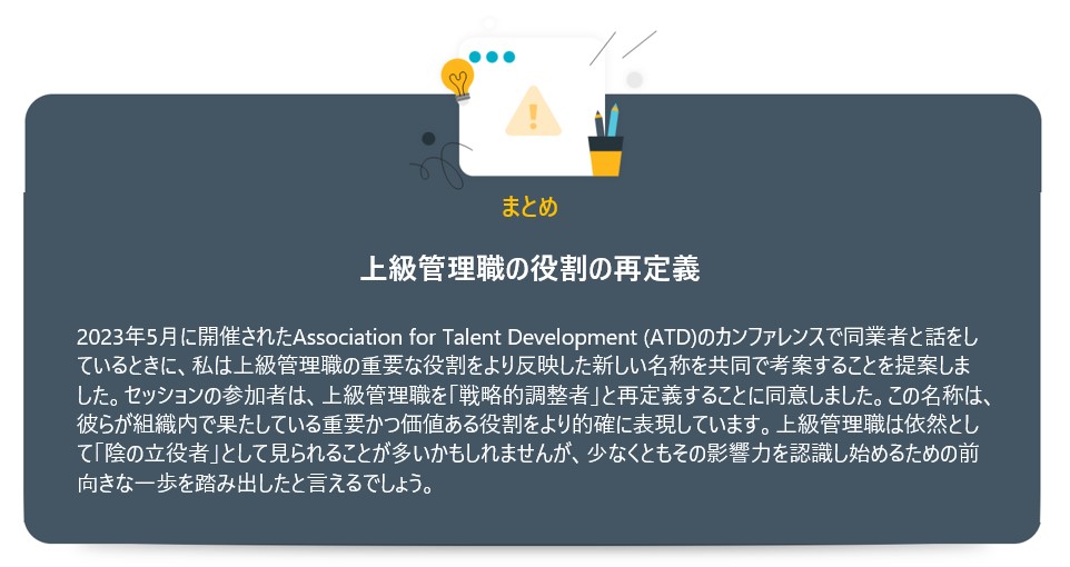 しかし、組織が上級管理職を排除するのは大きな過ちです。上級管理職がいなければ、組織は変革を推進するのに必要なリーダーを欠くリスクを抱えることになります。変革を推進するリーダーは、現代のビジネスで生き残るために不可欠です。 本コラムでは、上級管理職の役割を定義し、優れた上級管理職が組織にもたらす大きな価値をお伝えします。また、戦略を成果に変えるという上級管理職特有の立場を踏まえ、彼らを育成し、成功に導くための最善の方法についても解説します。