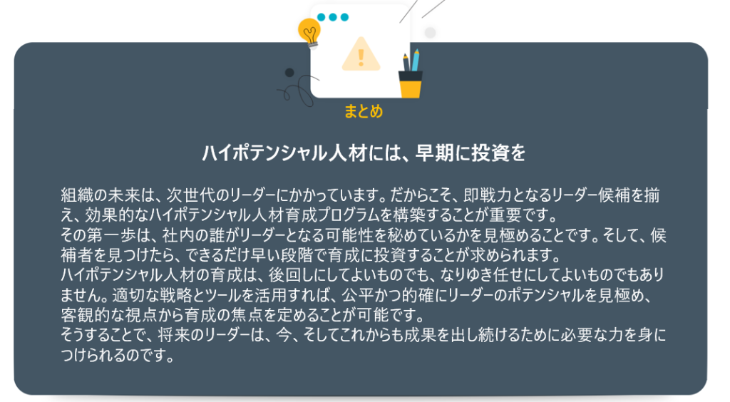 これらの定義を理解し、組織内で共通言語として浸透させることは、ハイポテンシャル人材を育成するうえで極めて重要です。今、適切な人材をハイポテンシャル人材育成プログラムに選抜できなければ、将来必要となるリーダーの確保は難しくなります。