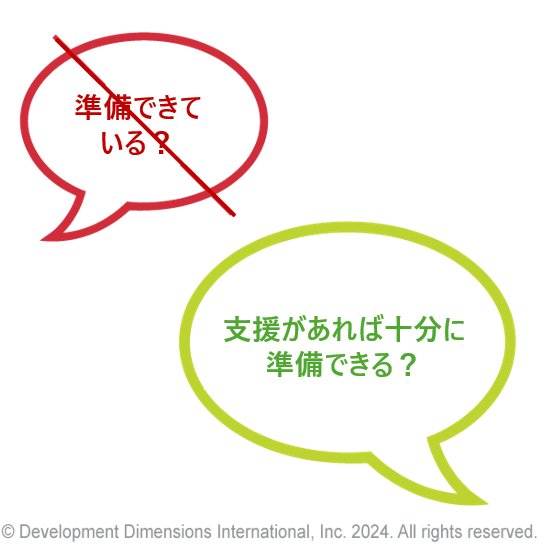 準備度は、今現在その人が特定の役割や職務にどれだけ適しているかを示す、比較的わかりやすい概念です。しかし、多くの組織やリーダーは、対象者が「準備できている」かを判断するのに非常に苦労しています。そこで重要なのは、「適切な支援があれば、次の任務にチャレンジできるだけの準備が整っているかどうか」を考えることです。